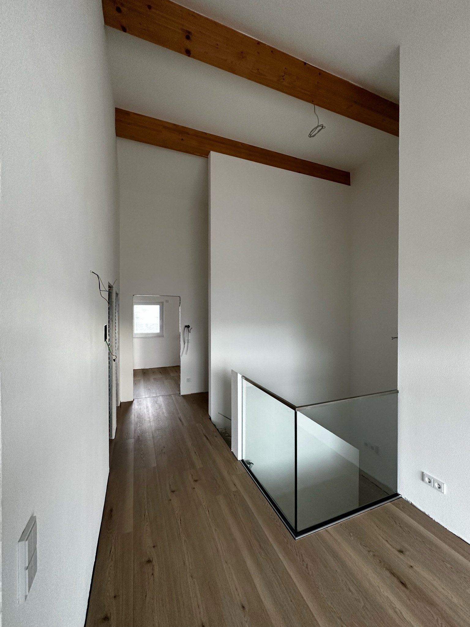 Die beiden Einfamilienhäuser fügen sich harmonisch in das Neubaugebiet ein und nutzen das natürliche Gefälle des Grundstücks als gestalterisches Element. Die halbgeschossig versetzte Doppelgarage ist architektonisch klug eingebunden und über eine Podesttreppe elegant mit dem Wohnhaus verbunden. Im Untergeschoss wurde nicht nur eine komfortable Einliegerwohnung geschaffen – zusätzlich stehen auch klassische Kellerräume zur Verfügung, die praktischen Stauraum und vielseitige Nutzungsmöglichkeiten bieten.